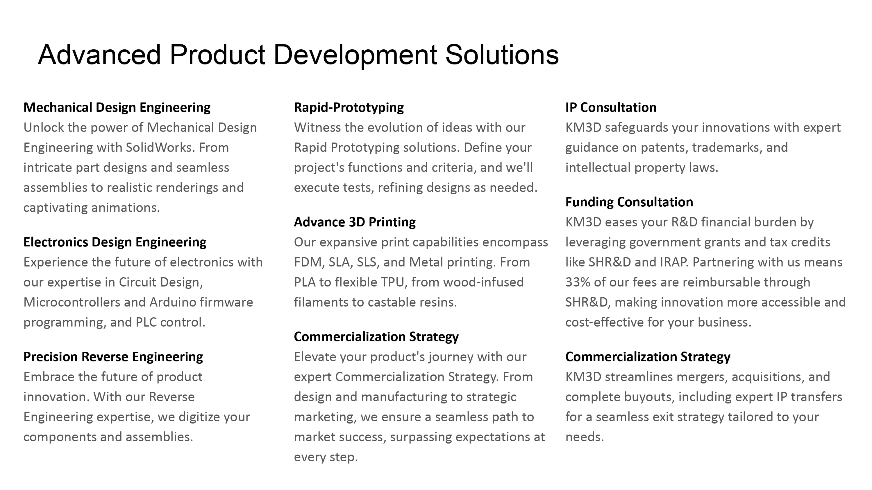 KM3D eases your R&D financial burden by leveraging government grants and tax credits like SHR&D. Partnering with us means 33% of our fees are reimbursable through SHR&D, making innovation cost-effective for your business.
